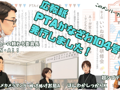 3月6日発行にて、金沢市PTA協議会広報紙「PTAかなざわ」104号を発行いたしました。 紙面はお子さんを通して各家庭に届いていると思います。AIについてのいいね保護者研修会、特色ある単位PTA活動、...