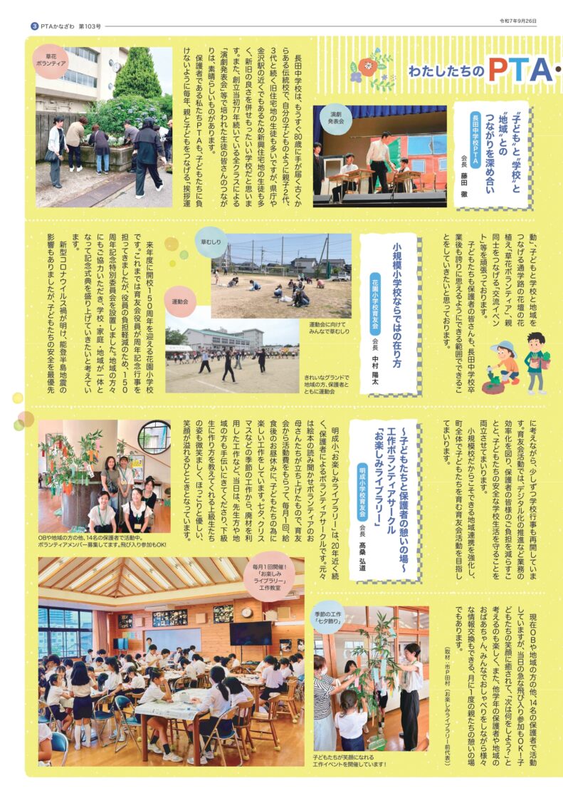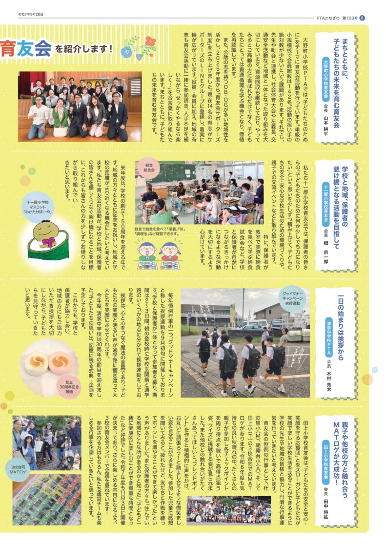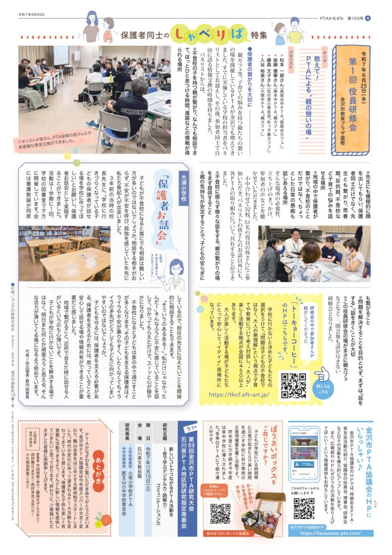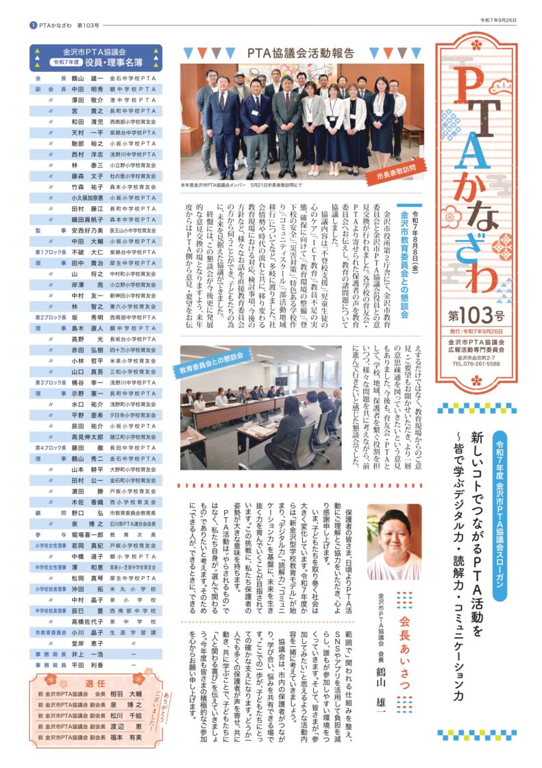 活動報告 PTA 金沢 広報誌 103号 2025年9月29日 ・金沢市教育委員会との懇談会 ・私たちのPTAを紹介します 大野町小学校育友会、十一屋小学校育友会、清泉中学校PTA、田上小学校育友会、長田中学校PTA、花園小学校育友会、明成小学校育友会 ・第一回役員研修会 テーマ『教えて!PTAによる、親の憩いの場』 ・保護者お話会 大浦小学校育友会 ・金沢ぼうさいボックス協議会 ・他